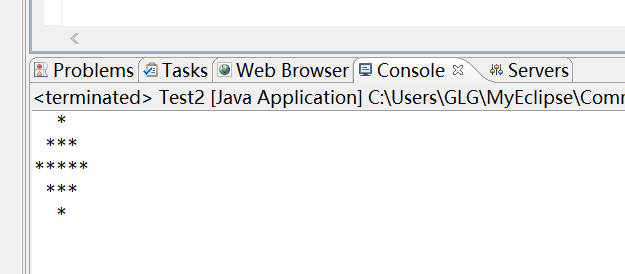 package homework; public class Test2 { /** * @param args */ public static void main(String[] args) { // TODO Auto-generated method stub System.out.println(" *"); System.out.println(" ***"); System.out.println("*****"); System.out.println(" ***"); System.out.println(" *"); } }