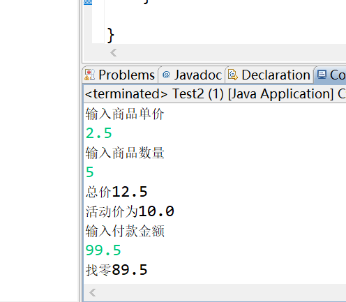 package home; import java.util.Scanner; public class Test2 { /** * @param args */ public static void main(String[] args) { // TODO Auto-generated method stub Scanner input=new Scanner(System.in); System.out.println("输入商品单价"); double danjia=input.nextDouble(); System.out.println("输入商品数量"); int shuliang=input.nextInt(); double zongjia=danjia*shuliang; System.out.println("总价"+zongjia); double huodongjia=zongjia*0.8; System.out.println("活动价为"+huodongjia); System.out.println("输入付款金额"); double fukuan=input.nextDouble(); double zhaoling=fukuan-huodongjia; System.out.println("找零"+zhaoling); } }