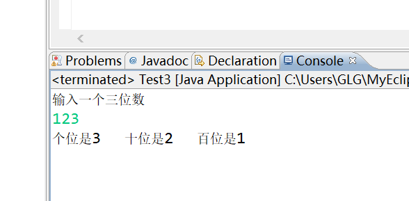 package home; import java.util.Scanner; public class Test3 { /** * @param args */ public static void main(String[] args) { // TODO Auto-generated method stub Scanner input=new Scanner(System.in); System.out.println("输入一个三位数"); int a=input.nextInt(); int ge,shi,bai; ge=a%100%10; shi=a%100/10; bai=a/100; System.out.println("个位是"+ge+"\t十位是"+shi+"\t百位是"+bai); } }