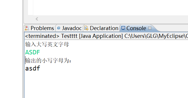 package home; import java.util.Scanner; public class Testttt { /** * @param args */ public static void main(String[] args) { // TODO Auto-generated method stub System.out.println("输入大写英文字母"); Scanner input=new Scanner(System.in); String daxie=input.next(); for(int i=0;i<daxie.length();i++) { char ch=daxie.charAt(i); if((ch>='A'&&ch<='Z')) { ch=(char)((int)ch+32); } } System.out.println("输出的小写字母为:"); System.out.println(daxie.toLowerCase()); } }
