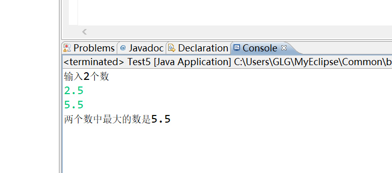 package home; import java.util.Scanner; public class Test5 { /** * @param args */ public static void main(String[] args) { // TODO Auto-generated method stub Scanner input=new Scanner(System.in); System.out.println("输入2个数"); double a=input.nextDouble(); double b=input.nextDouble(); double max=(a>b)?a:b; System.out.println("两个数中最大的数是"+max); } }