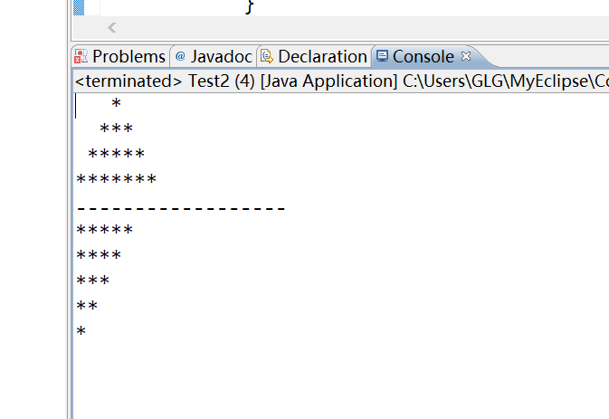 package home; public class Test2 { /** * @param args */ public static void main(String[] args) { // TODO Auto-generated method stub for (int i = 1; i <=4; i++) { for (int j = 1; j <=4-i; j++) { System.out.print(" "); } for (int k = 1; k <=2*i-1; k++) { System.out.print("*"); } System.out.println(); } System.out.println("------------------"); for (int i = 1; i <6; i++) { for (int j =6-i; j >0; j--) { System.out.print("*"); } System.out.println(); } } }