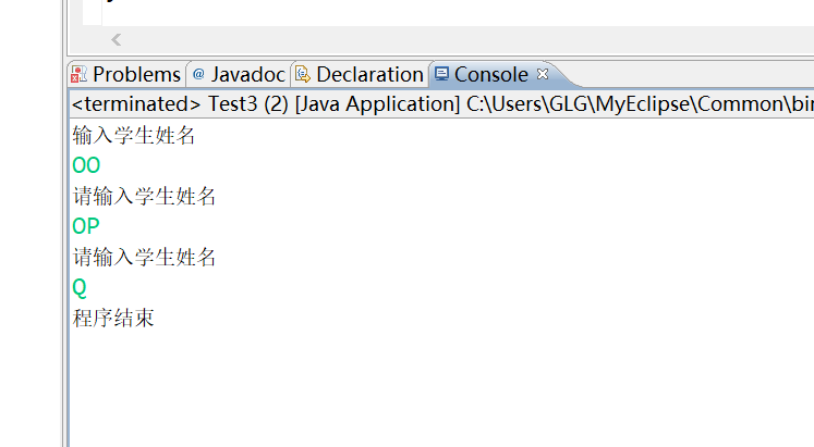 package home; import java.util.Scanner; public class Test3 { /** * @param args */ public static void main(String[] args) { // TODO Auto-generated method stub Scanner input=new Scanner(System.in); System.out.println("输入学生姓名"); while (true) { String name=input.next(); if(name.equals("Q")){ System.out.println("程序结束"); break; } System.out.println("请输入学生姓名"); } } }
