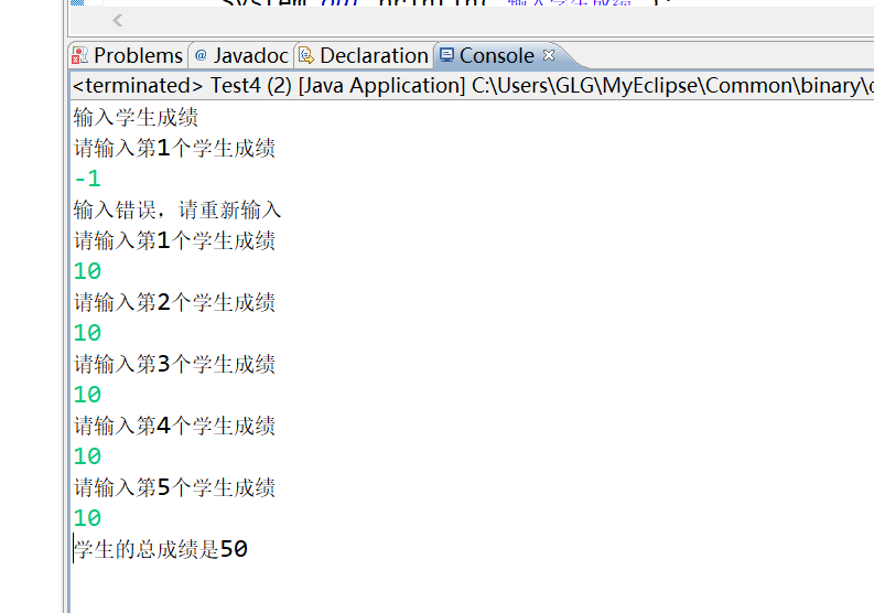 4.输入5个学生成绩,求和,当输入不合法的时候,提示输入错误重新输入。