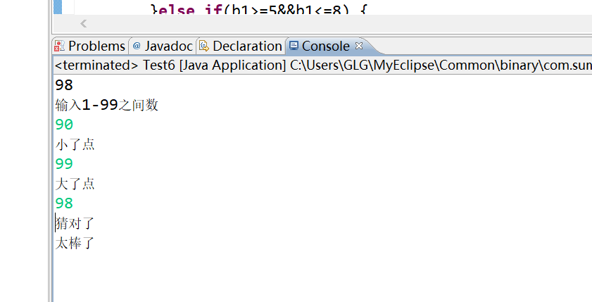 package home; import java.util.Random; import java.util.Scanner; public class Test6 { /** * @param args */ public static void main(String[] args) { // TODO Auto-generated method stub Random r=new Random(); int a=r.nextInt(100); System.out.println(a); Scanner input=new Scanner(System.in); System.out.println("输入1-99之间数"); int b1 = 0; while (true) { int b=input.nextInt(); b1++; if(b==a){ System.out.println("猜对了"); break; }else if(b>a) { System.out.println("大了点"); continue; }else if (b<a) { System.out.println("小了点"); continue; } } if (b1>=1&&b1<=3) { System.out.println("太棒了"); } else if(b1>=5&&b1<=8) { System.out.println("一般般"); }else if(b1>=5&&b1<=8) { System.out.println("太笨了"); } } }