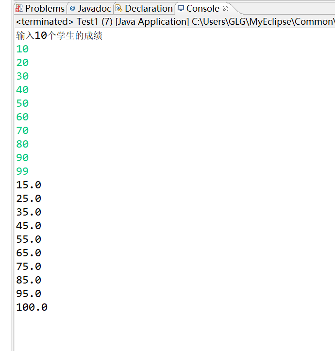 package homework; import java.util.Scanner; public class Test1 { /** * @param args */ public static void main(String[] args) { // TODO Auto-generated method stub double a[]=new double[10]; Scanner input=new Scanner(System.in); System.out.println("输入10个学生的成绩"); for (int i = 0; i < a.length; i++) { a[i]=input.nextDouble(); } for (int i = 0; i < a.length; i++) { a[i]=a[i]+5; if (a[i]>=100) { a[i]=100; } } for (int i = 0; i < a.length; i++) { System.out.println(a[i]); } } }