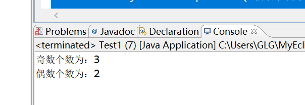 package homework; import java.util.Scanner; public class Test1 { /** * @param args */ public static void main(String[] args) { // TODO Auto-generated method stub int a[]={1,2,3,4,5}; int os=0; int js=0; for (int i = 0; i < a.length; i++) { if (a[i]%2==0) { os++; } else if(a[i]%2!=0){ js++; } } for (int i = 0; i < a.length; i++) { } System.out.println("奇数个数为:"+js); System.out.println("偶数个数为:"+os); } }