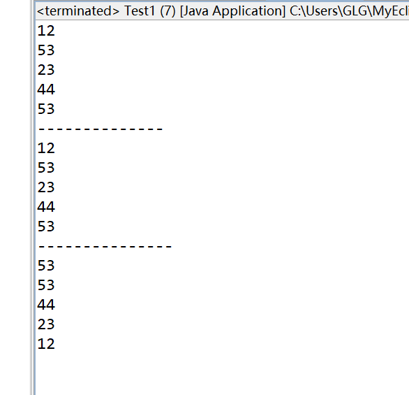package homework; import java.util.Scanner; public class Test1 { /** * @param args */ public static void main(String[] args) { // TODO Auto-generated method stub int arr[]={12,53,23,44,53}; for (int i = 0; i < arr.length; i++) { System.out.println(arr[i]); } System.out.println("--------------"); for (int i : arr) { System.out.println(i); } System.out.println("---------------"); for (int i = 0; i < arr.length-1; i++) { for (int j = 0; j < arr.length-1-i; j++) { if (arr[j]<arr[j+1]) { int m=arr[j]; arr[j]=arr[j+1]; arr[j+1]=m; } } } for (int i = 0; i < arr.length; i++) { System.out.println(arr[i]); } } }