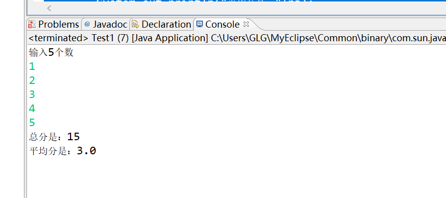 package homework; import java.util.Scanner; public class Test1 { /** * @param args */ public static void main(String[] args) { // TODO Auto-generated method stub int a[]=new int[5]; Scanner input=new Scanner(System.in); System.out.println("输入5个数"); for (int i = 0; i < a.length; i++) { a[i]=input.nextInt(); } int zf=0; double pj=0; for (int i = 0; i < a.length; i++) { zf+=a[i]; } pj=zf/a.length; System.out.println("总分是:"+zf); System.out.println("平均分是:"+pj); } }