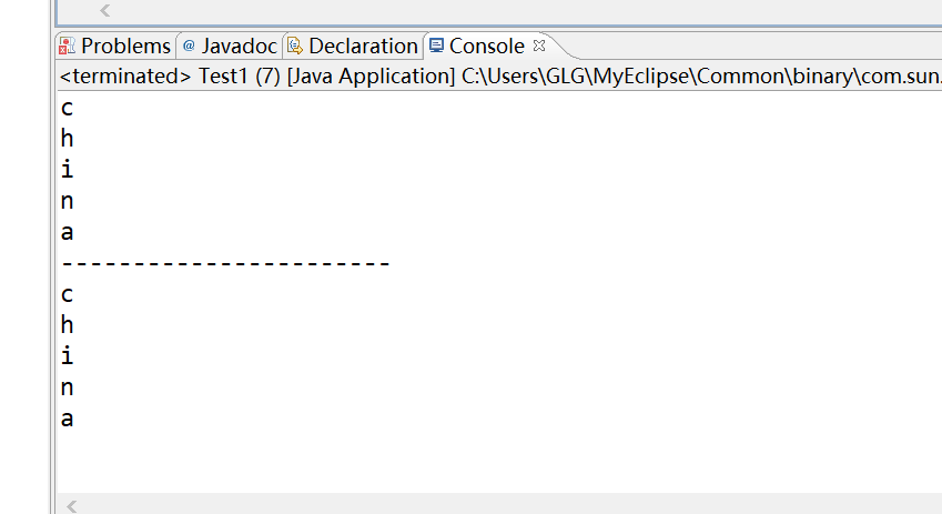 package homework; import java.util.Scanner; public class Test1 { /** * @param args */ public static void main(String[] args) { // TODO Auto-generated method stub char a[]={'c','h','i','n','a'}; for (char c : a) { System.out.println(c); } System.out.println("-----------------------"); for (char c = 0; c < a.length; c++) { System.out.println(a[c]); } } }