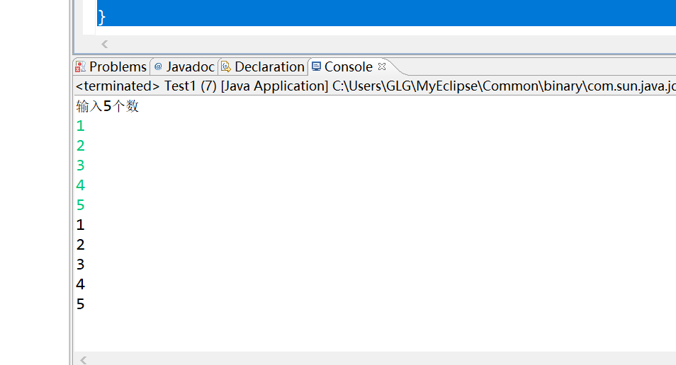 package homework; import java.util.Scanner; public class Test1 { /** * @param args */ public static void main(String[] args) { // TODO Auto-generated method stub int a[]=new int[5]; Scanner input=new Scanner(System.in); System.out.println("输入5个数"); for (int i = 0; i < a.length; i++) { a[i]=input.nextInt(); } for (int i = 0; i < a.length; i++) { System.out.println(a[i]); } } }