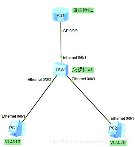 如图,PC1与W1为主机与交换机连接,为接入链路,应该使用access接口,PC2与W1也是access接口,access接口作用为:数据进入时打上VLAN标签,出去时脱去数据上的VLAN标签。