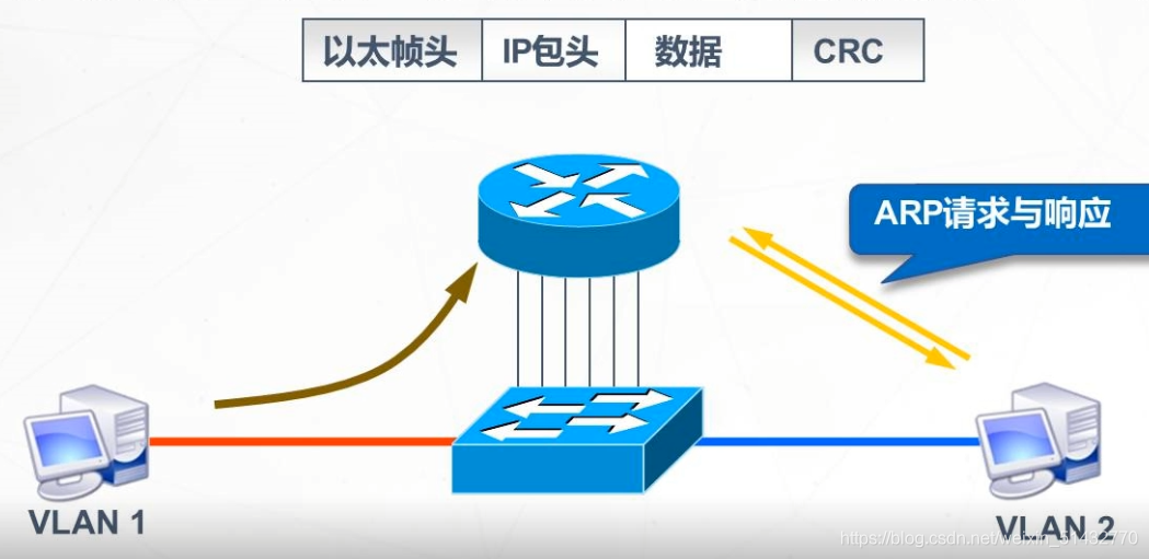 第三层引擎要将这个接收到的第一个数据包进行解封并重新封装新的MAC地址,但是它不知道VLAN2主机的MAC地址,所以要对VLAN2主机