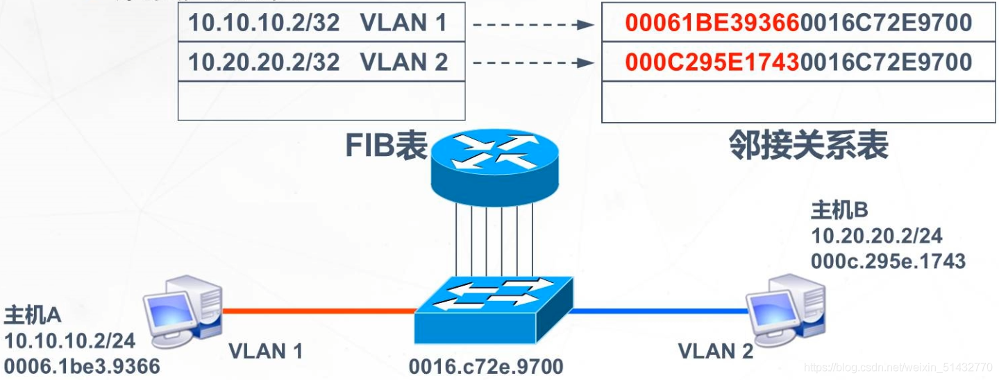 FIB表:包含相邻主机的IP地址以及对应VLAN的关系