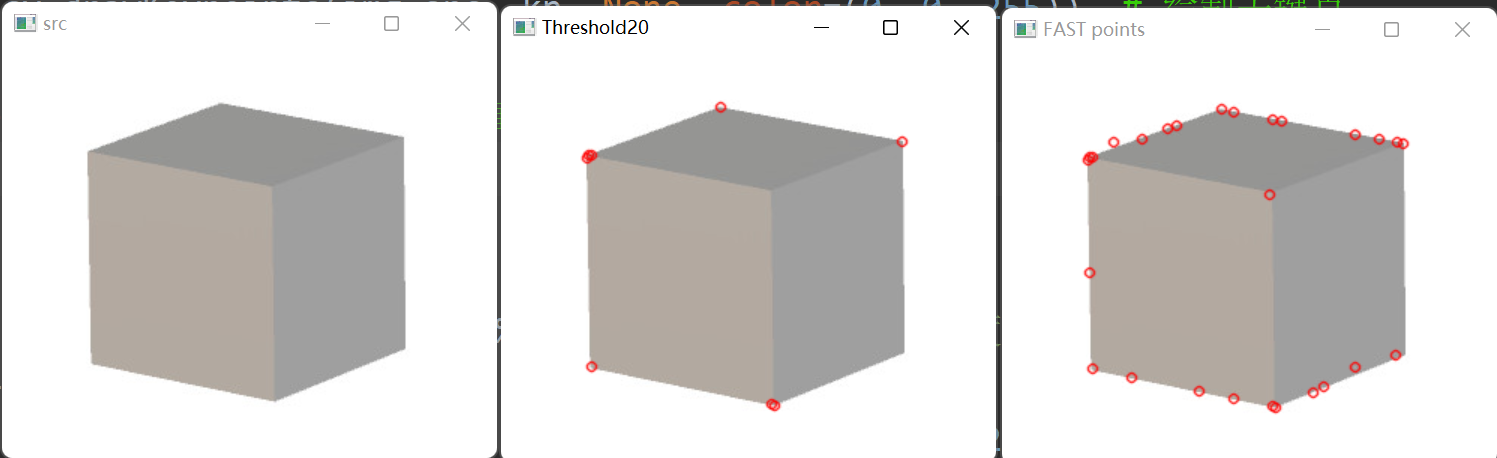 import cv2 as cv img_src = cv.imread('cube.jpg') # 打开图像,默认BGR格式 cv.imshow('src', img_src) fast = cv.FastFeatureDetector_create() # 创建FAST检测器 kp = fast.detect(img_src, None) # 检测关键点,不使用掩模 img2 = cv.drawKeypoints(img_src, kp, None, color=(0, 0, 255)) # 绘制关键点 cv.imshow('FAST points', img2) # 显示绘制了关键点的图像 fast.setThreshold(20) # 设置阈值,默认阈值为10 kp = fast.detect(img_src, None) # 检测关键点,不使用掩模 n = 0 for p in kp: print("第%s个关键点,坐标:" % (n + 1), p.pt, '响应强度:', p.response, '邻域大小:', p.size, '角度:', p.angle) n += 1 img3 = cv.drawKeypoints(img_src, kp, None, color=(0, 0, 255)) cv.imshow('Threshold20', img3) # 显示绘制了关键点的图像 cv.waitKey(0)