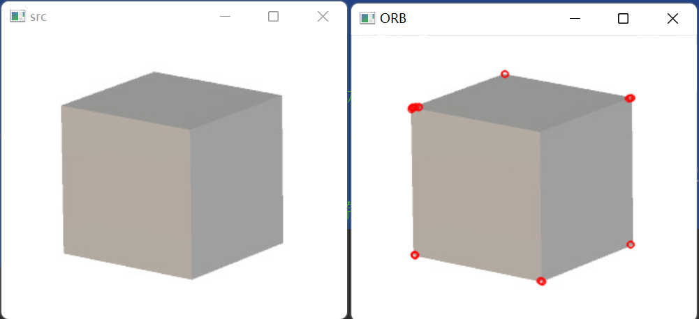 import cv2 as cv img_src = cv.imread('cube.jpg') # 打开图像,默认BGR格式 cv.imshow('src', img_src) orb = cv.ORB_create() # 创建ORB检测器对象 kp = orb.detect(img_src, None) # 检测关键点 img2 = cv.drawKeypoints(img_src, kp, None, color=(0, 0, 2550)) # 绘制关键点 cv.imshow('ORB', img2) # 显示绘制了特征点的图像 cv.waitKey(0)