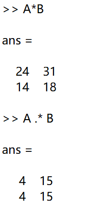 数组乘法:A.*B,A 和 B 的元素逐个对应相乘,两数组之间必须有相同的形,或其中一个是标量。