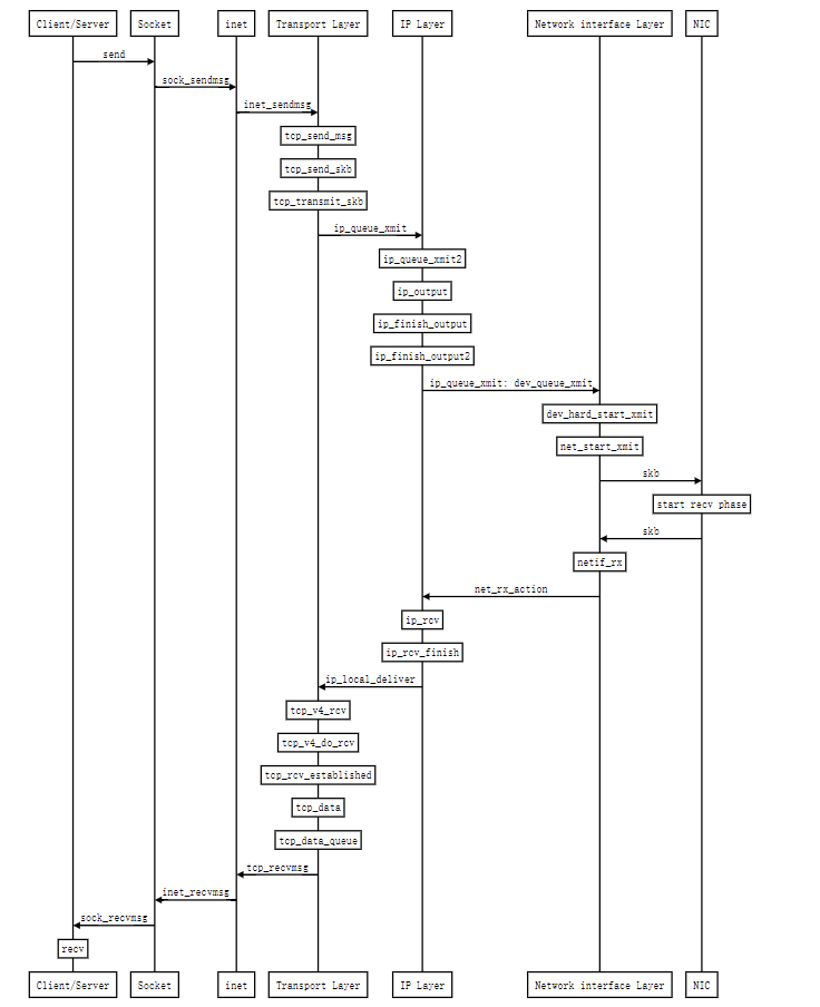 - 应用调用 Linux Socket 的 send 或者 write API 来发出一个 message 给接收端