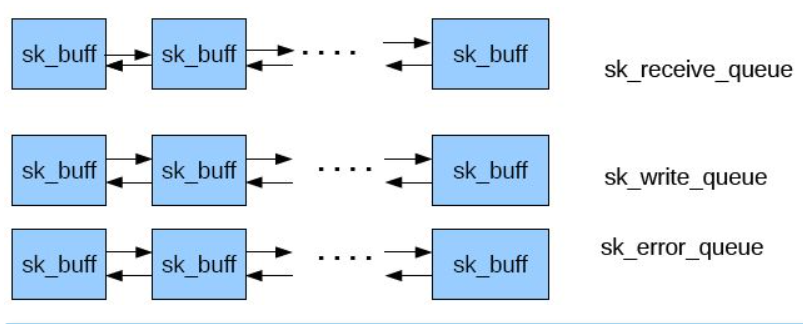 - 网络应用调用Socket API socket (int family, int type, int protocol) 创建一个 socket,该调用最终会调用 Linux system call socket() ,并最终调用 Linux Kernel 的 sock_create() 方法。该方法返回被创建好了的那个 socket 的 file descriptor。对于每一个 userspace 网络应用创建的 socket,在内核中都有一个对应的 struct socket和 struct sock。其中,struct sock 有三个队列(queue),分别是 rx , tx 和 err,在 sock 结构被初始化的时候,这些缓冲队列也被初始化完成;在收据收发过程中,每个 queue 中保存要发送或者接受的每个 packet 对应的 Linux 网络栈 sk_buffer 数据结构的实例 skb。