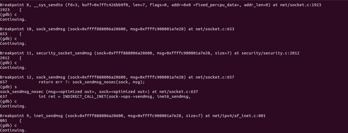 至此,发送端调用完毕。我们可以通过gdb进行调试验证: