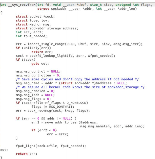 - 每当用户应用调用 read 或者 recvfrom 时,该调用会被映射为/net/socket.c 中的 sys_recv 系统调用,并被转化为 sys_recvfrom 调用,然后调用 sock_recgmsg 函数。