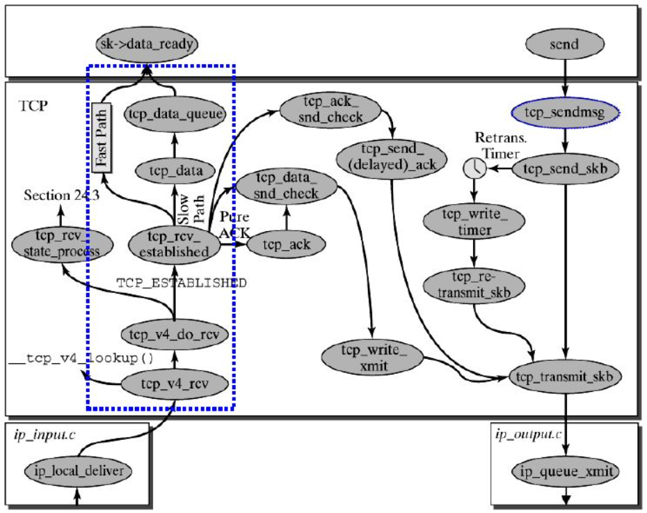 - 传输层 TCP 处理入口在 tcp_v4_rcv 函数(位于 linux/net/ipv4/tcp ipv4.c 文件中),它会做 TCP header 检查等处理。