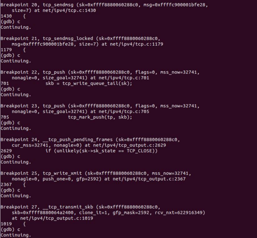 调用完毕之后进入tcp栈,调用完毕,通过gdb验证如下: