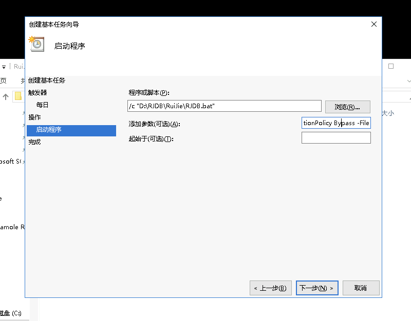 参数:/c "D:\RJDB\RuiJie\RJDB.bat"(替换为你的脚本绝对路径,例如/c "D:\scripts\CleanOldBackups.bat")。