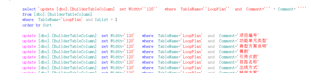 select 'update [dbo].[BuilderTableColumn] set Width=''120'' where TableName=''LoopPlan'' and Comment=''' + Comment+ '''' from [dbo].[BuilderTableColumn] where TableName='LoopPlan' and IsList = 1 order by Sort