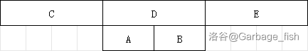 为什么不会算重?如下图,\(A,B\) 区间计算完之后合并成 \(D\) 区间,如果 \(D\) 区间和 \(C\) 一起处理,那 \(B\) 中的数也不会和 \(A\) 再计算一次,因为都在 \(D\) 里面。如果和 \(E\) 一起处理,那 \(B\) 区间的数是被用于计算的数,也不会多算。