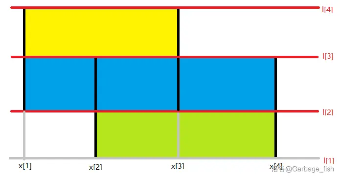 从下往上看,先将 \(x_2\sim x_4\) 这一段区间增加 \(1\)(意义为新增 \(1\) 个图形覆盖这段区间),然后 \((x_4-x_2)\times (l_2-l_1)\) 就是绿色的面积。
