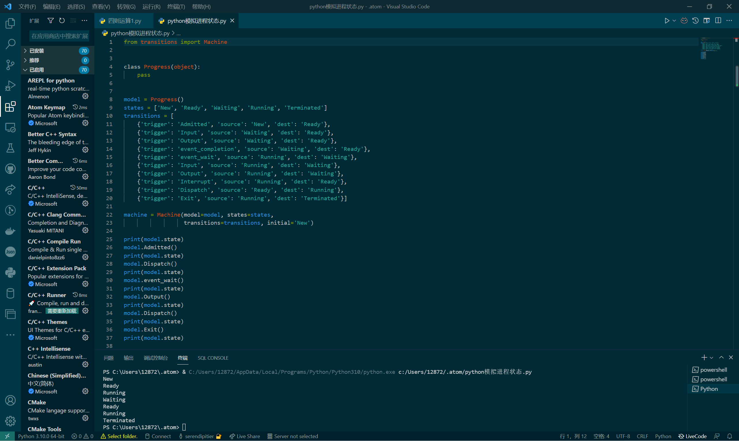 from transitions import Machine class Progress(object): pass model = Progress() states = ['New', 'Ready', 'Waiting', 'Running', 'Terminated'] transitions = [ {'trigger': 'Admitted', 'source': 'New', 'dest': 'Ready'}, {'trigger': 'Input', 'source': 'Waiting', 'dest': 'Ready'}, {'trigger': 'Output', 'source': 'Waiting', 'dest': 'Ready'}, {'trigger': 'event_completion', 'source': 'Waiting', 'dest': 'Ready'}, {'trigger': 'event_wait', 'source': 'Running', 'dest': 'Waiting'}, {'trigger': 'Input', 'source': 'Running', 'dest': 'Waiting'}, {'trigger': 'Output', 'source': 'Running', 'dest': 'Waiting'}, {'trigger': 'Interrupt', 'source': 'Running', 'dest': 'Ready'}, {'trigger': 'Dispatch', 'source': 'Ready', 'dest': 'Running'}, {'trigger': 'Exit', 'source': 'Running', 'dest': 'Terminated'}] machine = Machine(model=model, states=states, transitions=transitions, initial='New') print(model.state) model.Admitted() print(model.state) model.Dispatch() print(model.state) model.event_wait() print(model.state) model.Output() print(model.state) model.Dispatch() print(model.state) model.Exit() print(model.state)