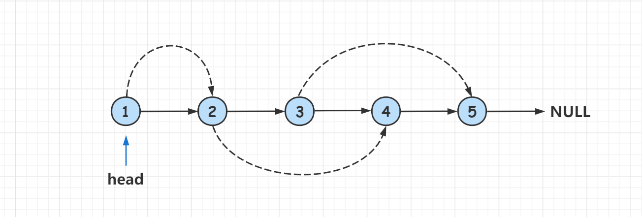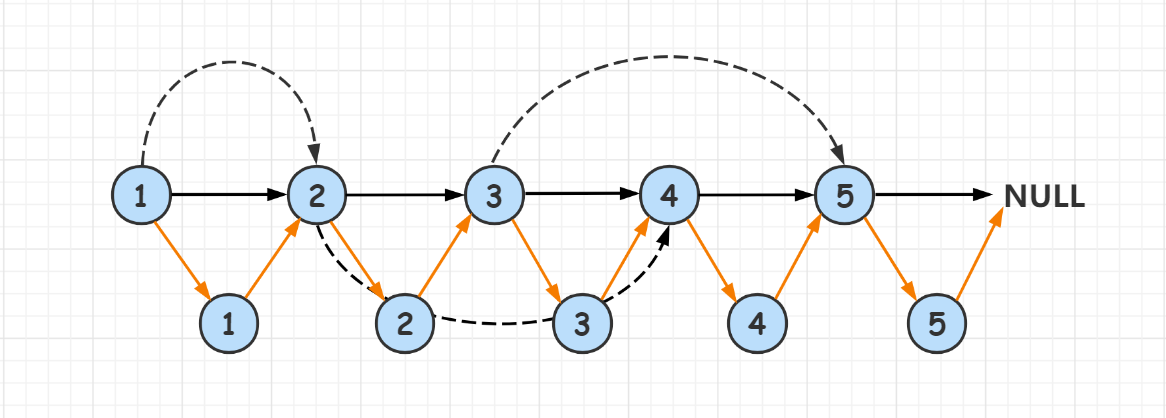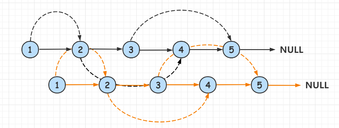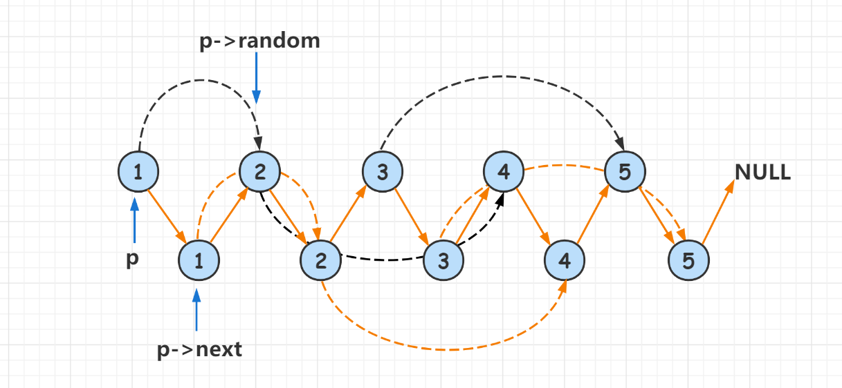 的链表,该链表除了每个节点有一个指针指向下一个节点外,还有一个额外的指针指向链表中的任意节点或者 null