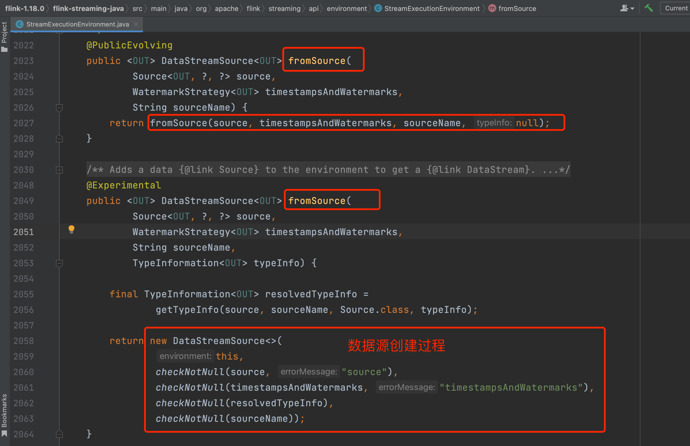 首先调用StreamExecutionEnvironment.fromSource()方法创建DataStreamSource类型的DataStream。