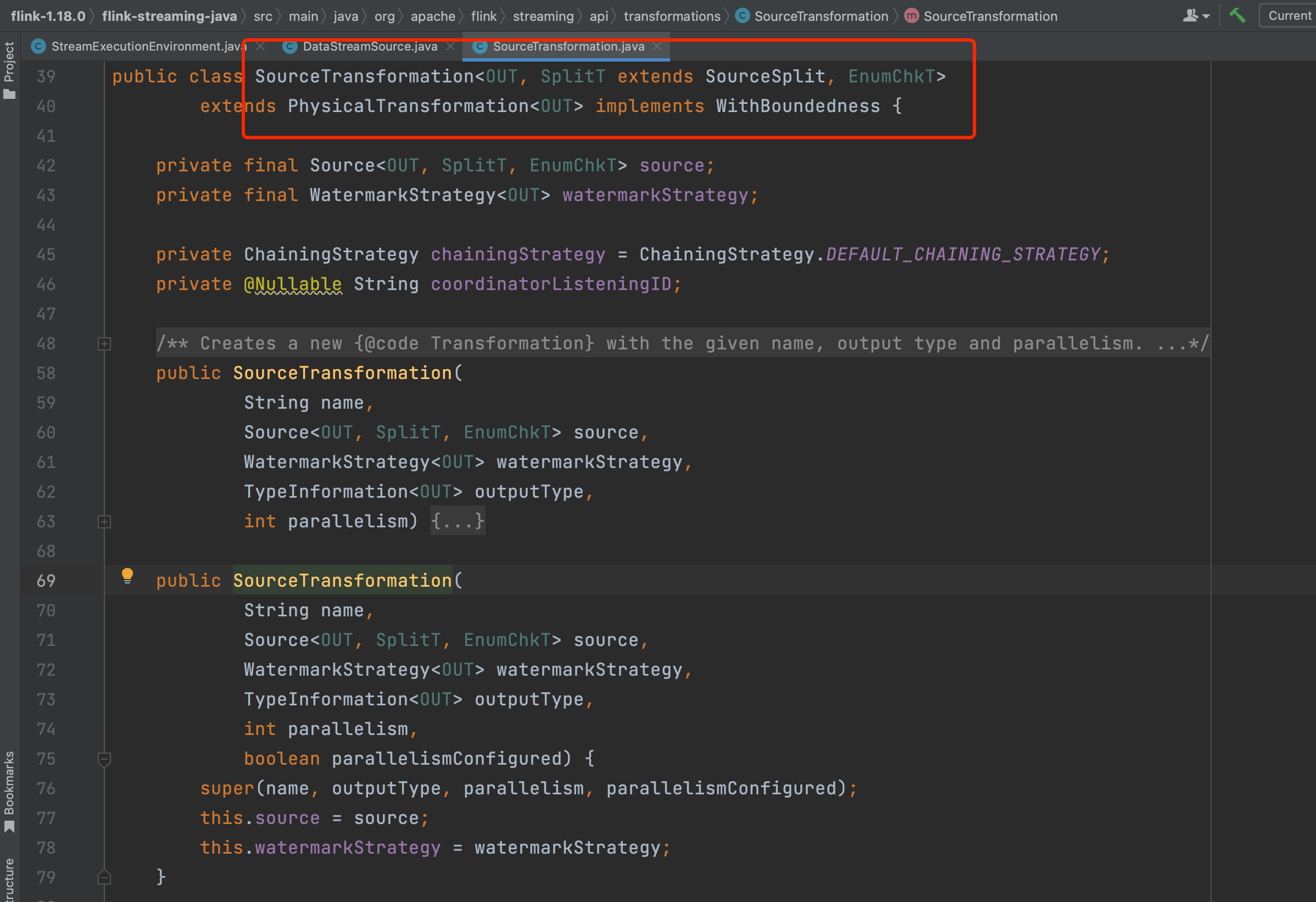 其次在创建DataStream过程中,会创建SourceTransformation,并设置DataStream的2个关键成员变量environment和transformation。
