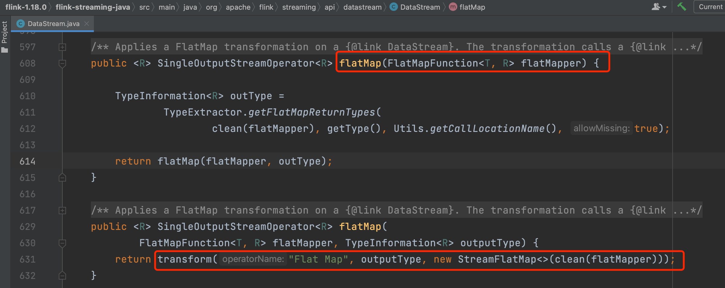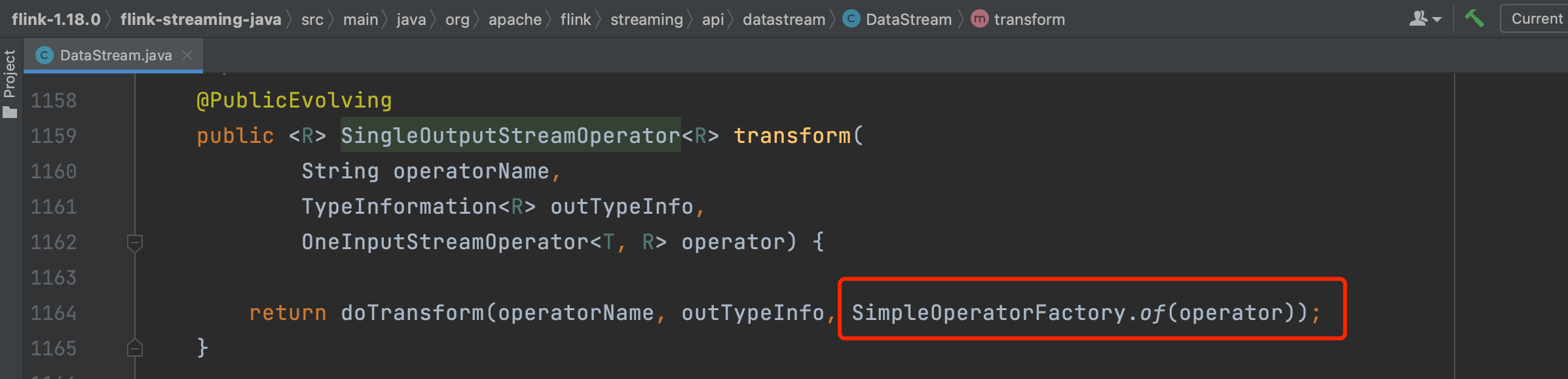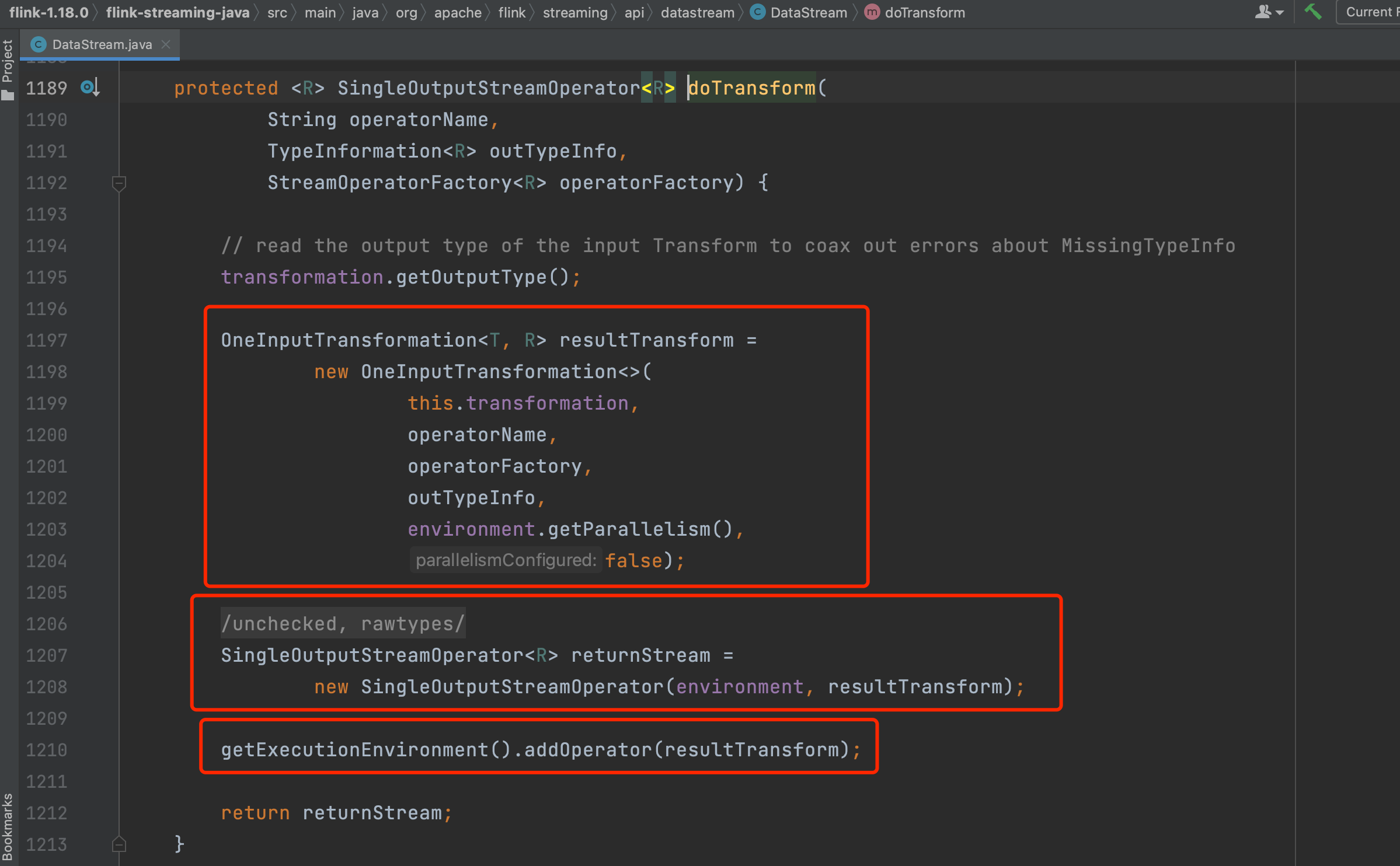 getExecutionEnvironment().addOperator(resultTransform);//此行代码调用会将resultTransform添加到StreamExecutionEnvironment的transformations集合列表中,transformations收集每个DataStream api调用生成的Transformation,将业务逻辑串联起来。后续生成StreamGraph、JobGraph时会用到该集合列表。