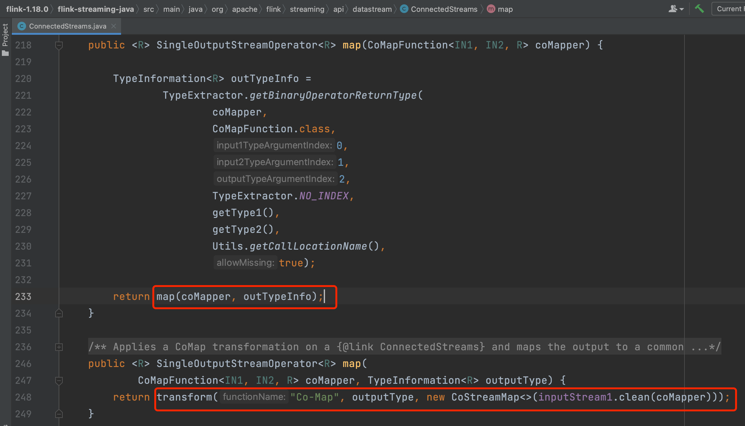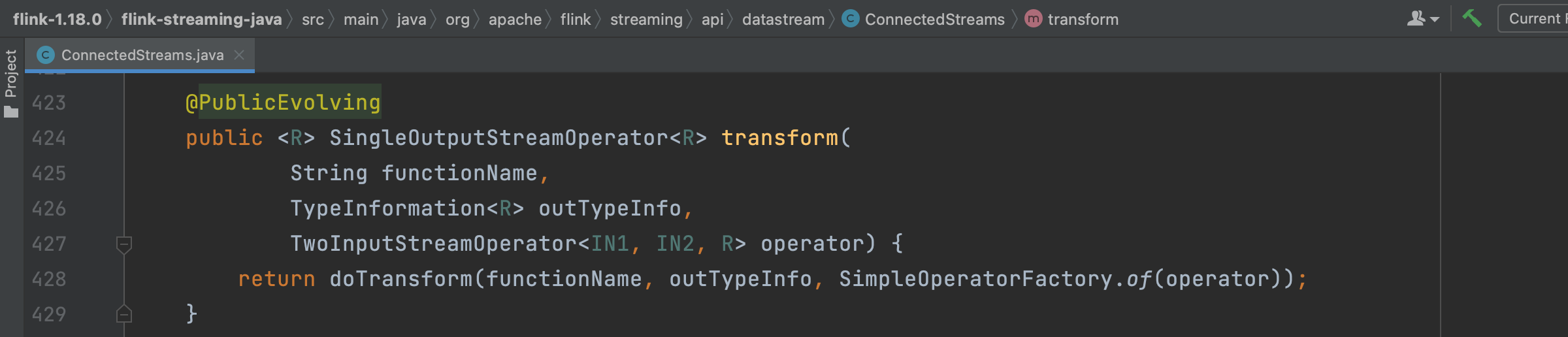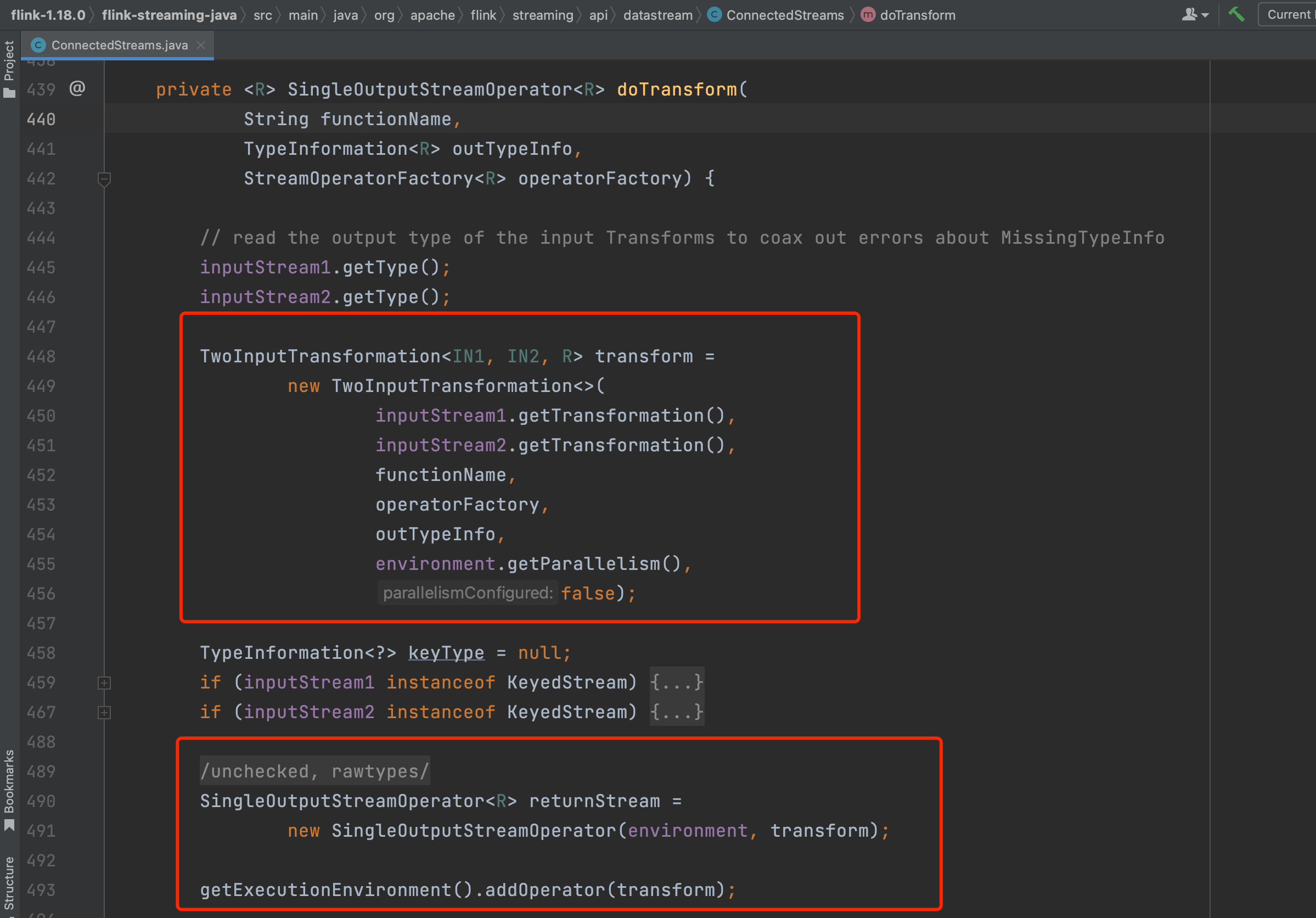 2个DataStream的connect方法调用会生成ConnectedStreams实例,在该实例上调用map()、flatMap()、process()等api会生成TwoInputTransformation。以map()调用为例,最终会调用transform()方法和doTransform()方法。