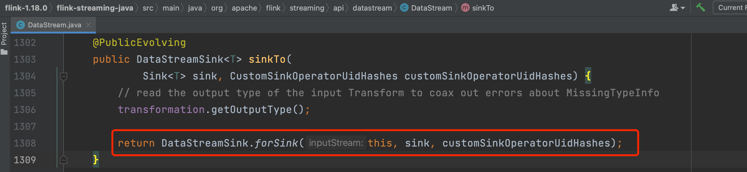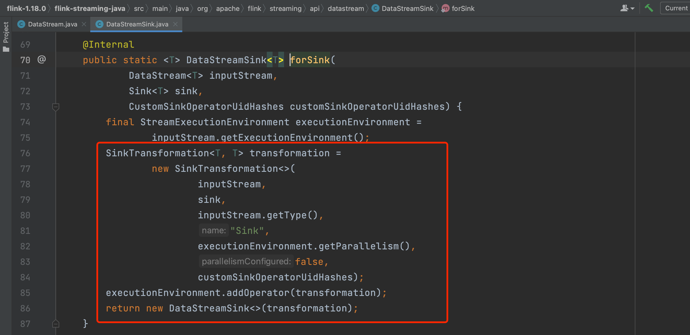 调用DataStream.sinkTo()方法会生成DataStreamSink实例,在生成过程中会创建SinkTransformation实例并赋值给DataStreamSink.transformation成员变量。并且依旧会将transform添加到StreamExecutionEnvironment的transformations集合列表中。