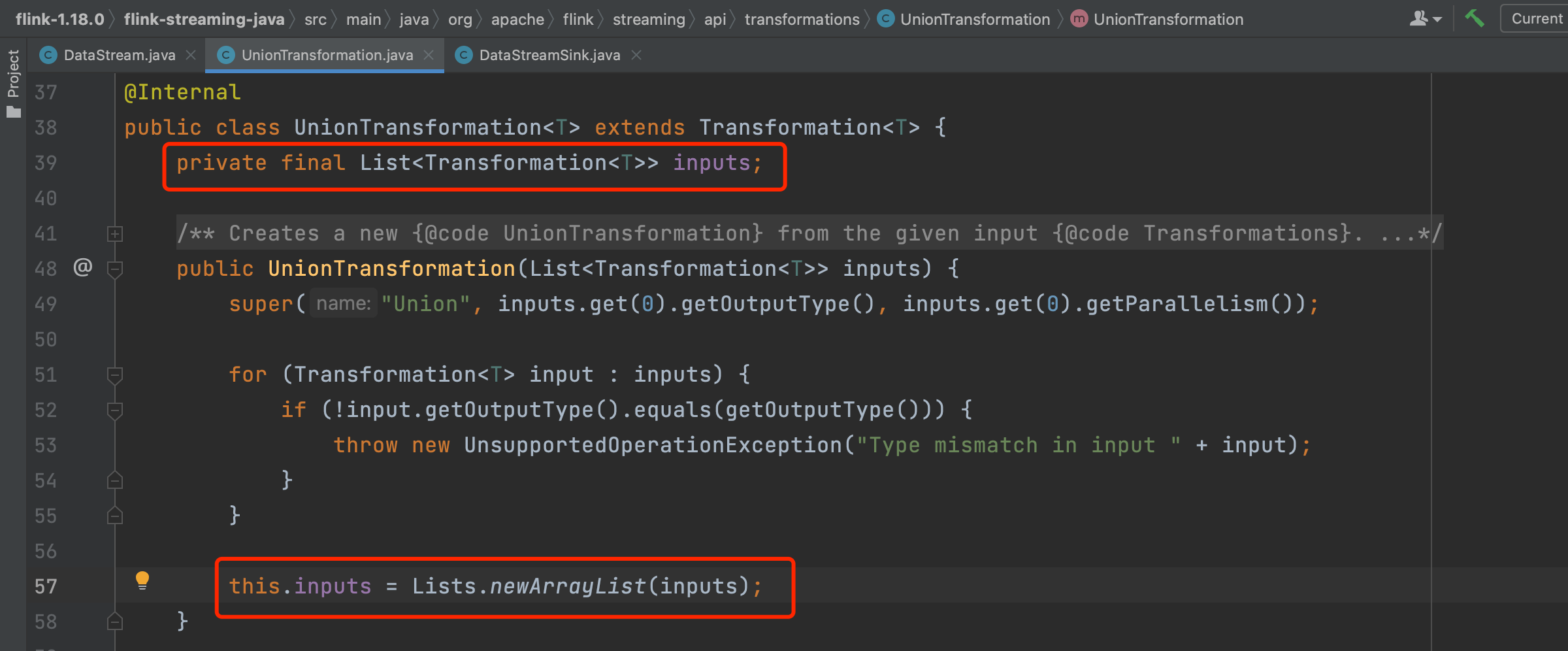 OneInputTransformation有一个Transformation<IN> input成员变量,代表本Transformation由上游Transformation生成而来。每个DataStream都有一个Transformation对象,表示该DataStream从上游的DataStream使用该Transformation而来。DataStream flatMapS = ds.flatMap(new FlatMap(){xxx});。DataStream ds通过flatMap调用生成resultTransform,将resultTransform赋值给returnStream的transformation变量,并返回returnStream。