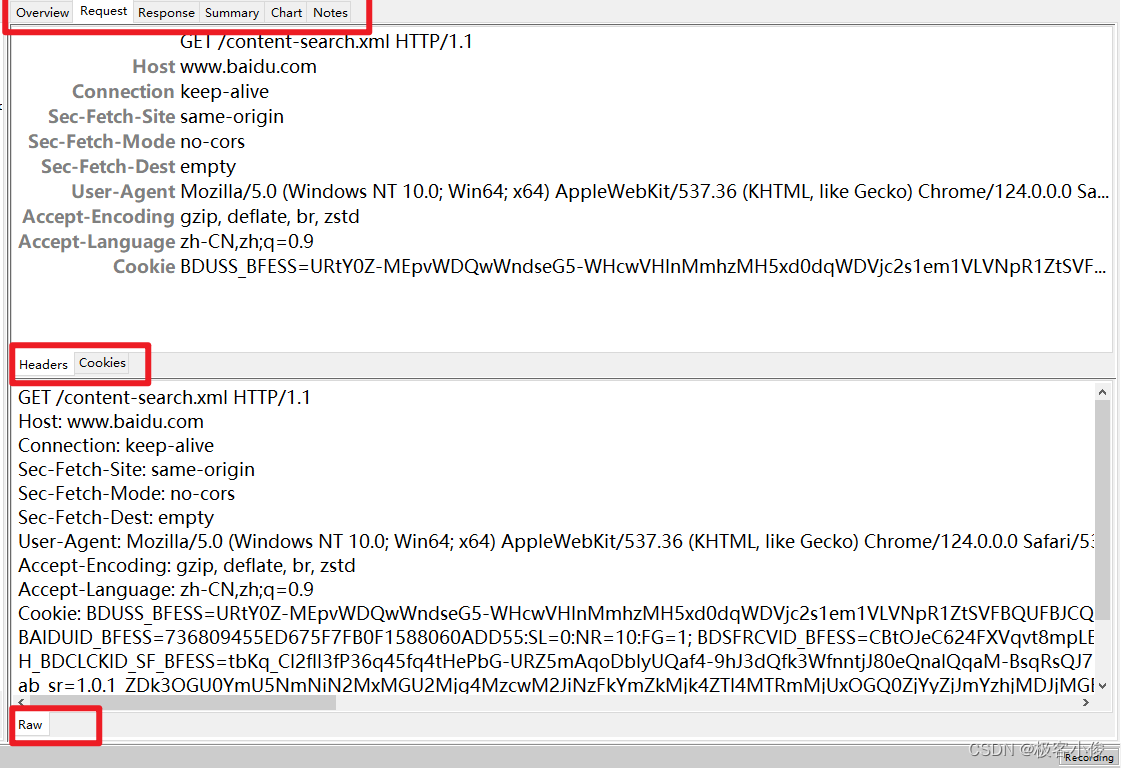 同时我们在请求响应显示框还可以切换导航栏选项卡查看请求的各种详细情况!