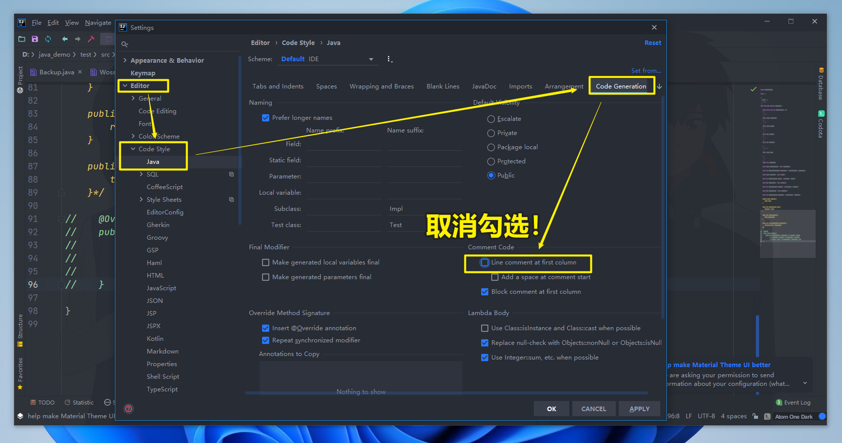 在右侧找到Code Generation(代码生成)中的Comment Code
