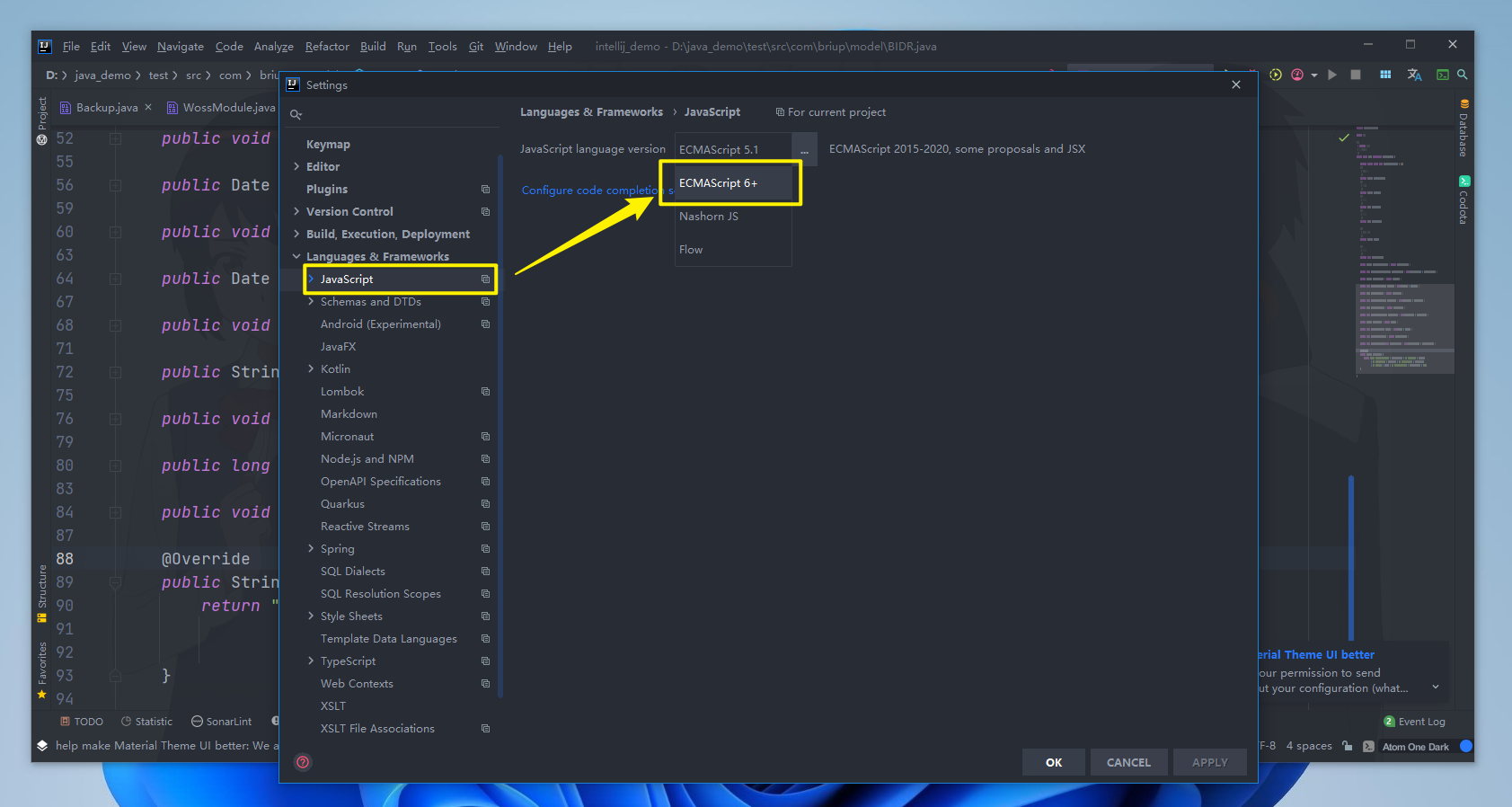找到File--->Settings--->Languages & Frameworks---->Javascript,就可以修改JavaScript的版本了