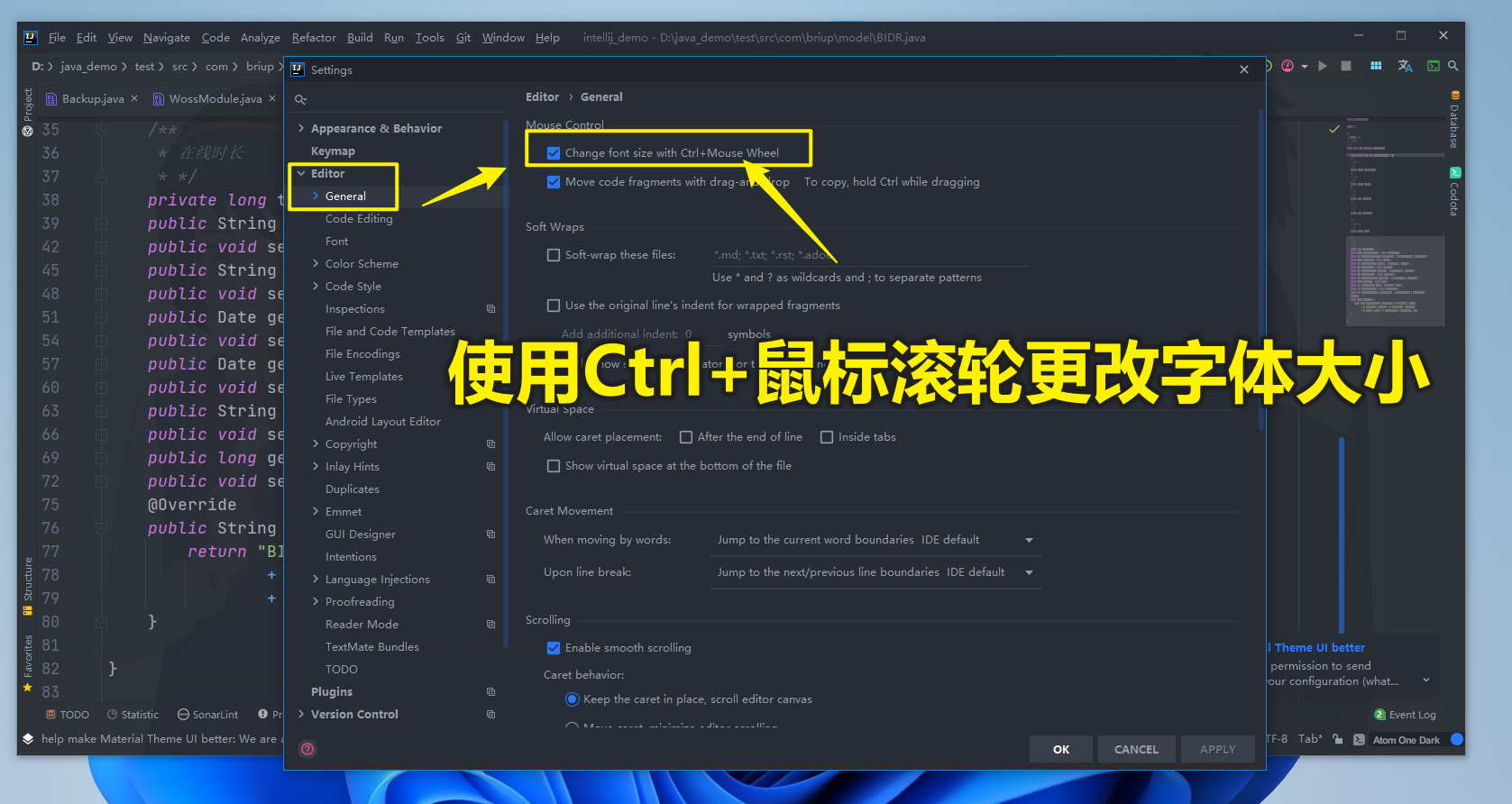 找到Change font size with Ctrl + Mouse Wheel(使用Ctrl+鼠标滚轮更改字体大小) 把这个选项勾选上就可以了!