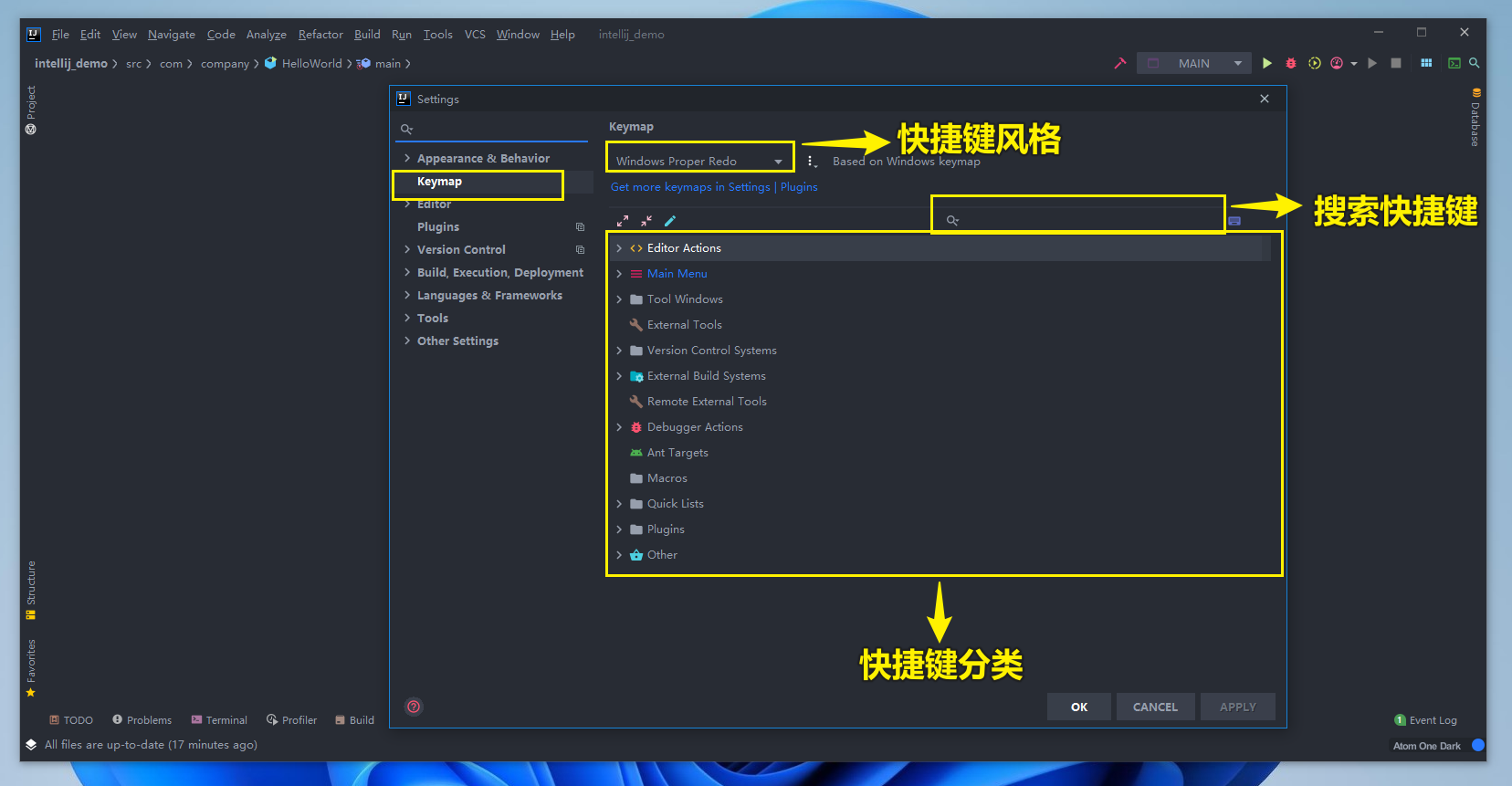 想要自定义快捷首先找到快捷键的设置界面,需要找到File->Setting->KeyMap界面,如下图: