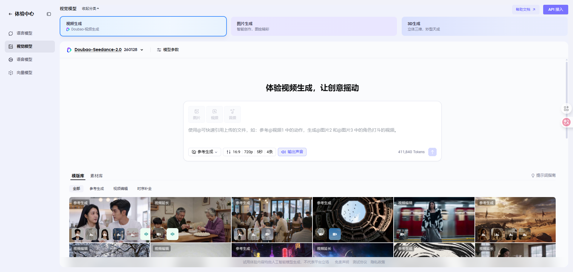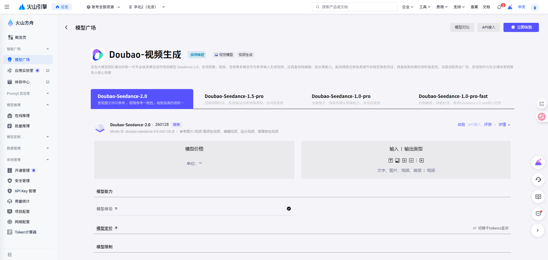 继续选择Doubao-Seedance-2.0进行API调用或右侧的在线体验
