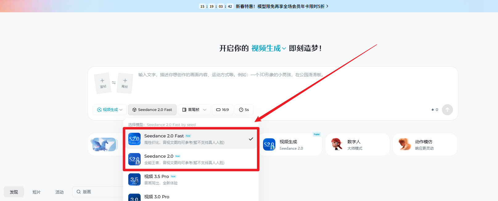 在视频生成界面选择Seedance 2.0模型就可以使用了!
