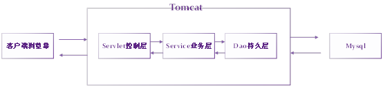 所有服务部署在Tomcat上,Servlet控制层响应客户端的请求,随后调用Service业务层,Service调用Dao层中的功能,在Dao层中连接Mysql数据库,Mysql响应数据返回Dao层Service层Servlet层 最后返回至客户端