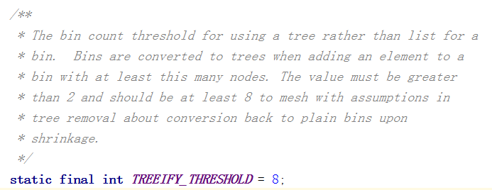 - jdk1.8中,当链表节点较少时仍然以链表存在,当链表节点较多时,默认是大于8时会转为红黑树,代码如下