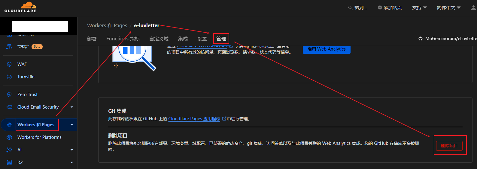 前端部署项目删除以 Cloudflare 为例,其余类似: