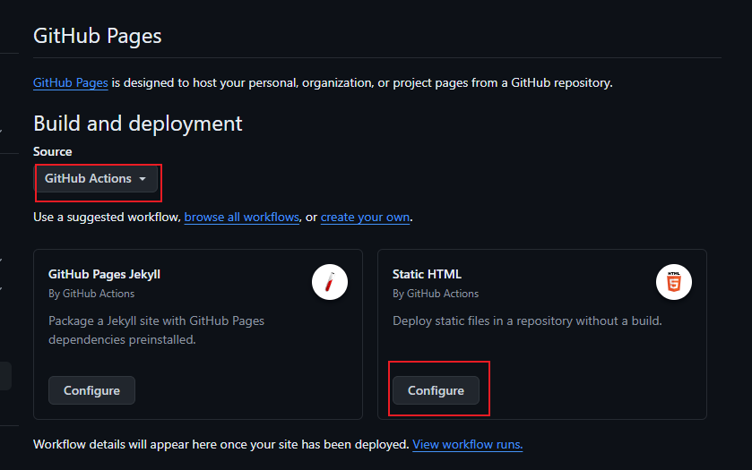 Build and deployment下的Source下拉菜单选择GitHub Actions; -